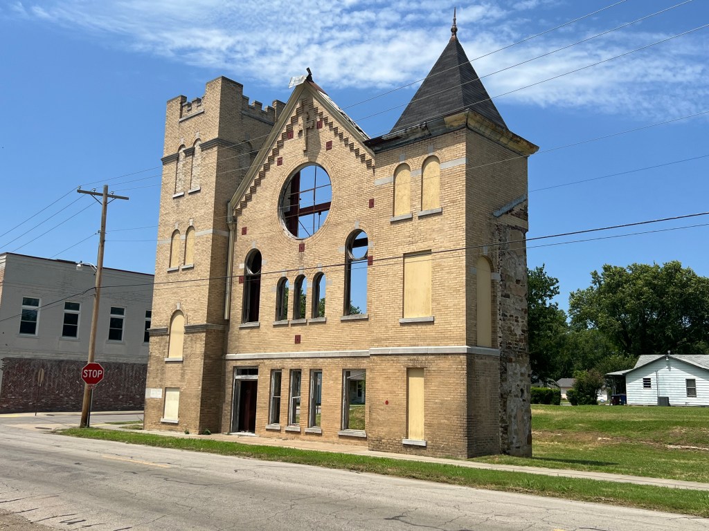 When I went online, I found the Mallalieu Methodist Episcopal (M.E.) Church was established in 1885 as an African American congregation of the local Methodist Church. The brick building was built in 1921 and according to the inset cornerstone was “cleared of all indebtedness” on October 15, 1947. The building served the congregation until it relocated across the street as the Mission United Methodist Church in the late 1980’s. The Mallalieu building remained vacant and was severely damaged by the elements and the stained glass windows were sold to an out of state collector. The Howard Foundation was a non-profit started in 1988 to raise funds for the building’s rehabilitation. The long-term goal was to develop the Mallalieu building as an outreach center for the youth on the north side of Fort Smith. That did not happen, and by 2014 the rear of the building had been destroyed leaving the front facade and bracing support. There is no signage to indicate the historic past or present plans for the impressive structure that remains.