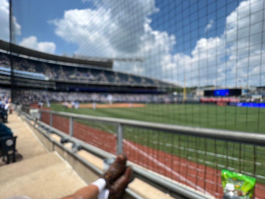 I decided to spend a few days with my brother and sister-in-law in Kansas City over the 4th of July. I drove up Sunday and arrived in time to attend the Royals-Dodgers game in the afternoon. I had bought tickets and the required parking pass online and loaded them to my phone. I flashed my pass and then met my brother at the gate. I flashed my tickets at the gate, and we went seamlessly into the stadium. I had gift cards to the Royals store that were only accessible at the stadium, so we went into the gift shop hoping to purchase a tee shirt or some other small item. The shop was full of autographed balls and rows of jerseys along the wall. The jerseys were autographed and were from current players. They started at US$500 so I moved on. Another wall had signed jerseys of “discontinued” players that were discounted to only US$175. The balls were more reasonable but started at US$75. I decided I did not need anything from the shop after all. We did not purchase any memorabilia and made our way down to our front row seats near the right field foul pole.