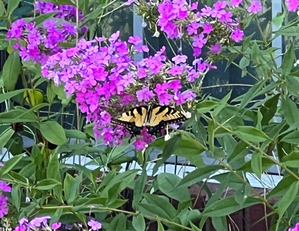 Last summer I noted the eastern black swallowtail (Papilio polyxenes) enjoying the nectar of our Garden Phlox (Phlox paniculata) that line the bed along the front of our house. While I have not seen another of that type, there have been a few monarch butterflies (Danaus plexippus), also known as the common tiger, flitting the phlox. Yesterday I went out to the car and noticed another type of butterfly. This was like the black swallowtail, but the front wings were primarily yellow with four black bands. My first impression as it flitted from flower to flower was that it looked like a small tiger pouncing on its prey.