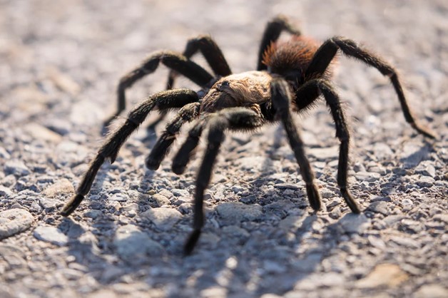 When I looked online, I found the Texas brown tarantula (Aphonopelma hentzi), also known as Oklahoma brown tarantula or Missouri tarantula, is one of the most common species of tarantula living in the Southern US. The large brown spider can be found in parts of Mexico, along with six US states (Texas, Missouri, Oklahoma, Kansas, Arkansas, and Louisiana). The stocky arachnids can grow to be four to five inches (10 to 12.5 cm) long and weigh between 1 to 3 ounces (28 to 85 grams). Coloration ranges from light brown to black and may vary between individuals. The generally docile tarantula is often kept as a pet. The brown tarantula has venom that is toxic to very small animals but not humans. If incited, they may stand on their back legs to show their fangs to intimidate a potential threat but will not strike unprovoked. The dense hairs on their body are also used to fling at the eyes of a predator when they are threatened. Though they look scary, the tarantula is generally shy and avoids human contact. During mating season, however, they are more on the move.