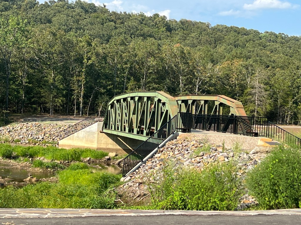 When I looked online, I found the bridge had been dedicated June 10 in honor of Dr. Thomas R. Cuthbert Jr. and Ernestine Strang Cuthbert, who lived in lived in a home overlooking Greenwood Lake. Cuthbert Bridge was built by the Virginia Bridge and Iron Co. in Roanoke, Virginia in 1931 to span across Terre Rouge Creek northeast of Hope, Arkansas. The bridge was decommissioned in March 2009 and donated by the Arkansas Department of Transportation to the city of Greenwood. The bridge was kept in storage, “awaiting a worthy cause and funding” until 2022, when a vision for its use was made possible by the dedication of donors. The old car bridge is now used for foot or bicycle traffic by people who want to hike across or fish off it at the lake. The bridge is open to the public.