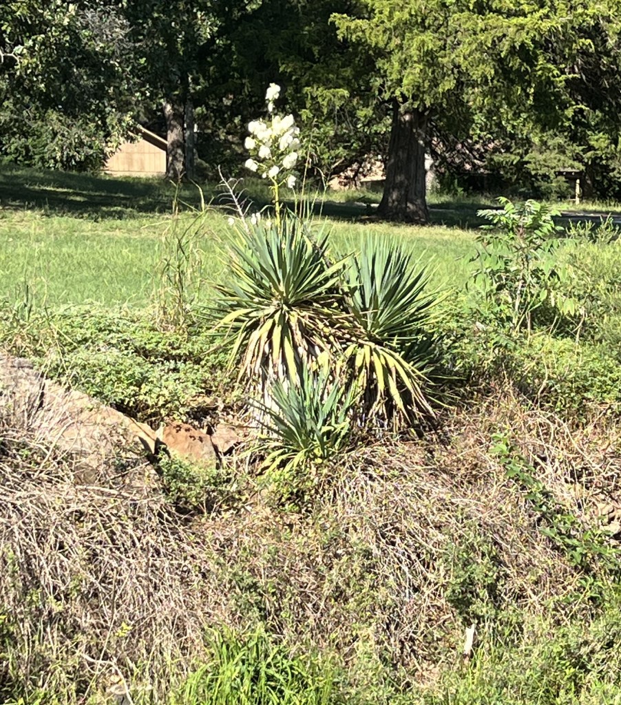 I have been researching how to amend my garden beds in preparation for winter. In the past I have basically pulled the dead plants and let the ground fallow until the following spring. I have begun to think this is why (in part) I am getting decreasing yields. I watched several YouTube videos explaining what I needed to do and why. They all began saying I needed to get my soil tested at the local county extension to tell me if I needed more lime (alkaline) or sulfur (acid) in my soil, and whether to add more nutrients. I was not worried about my containers as I had filled them with new potting soil earlier in the spring. I decided I needed to amend the ground soil with vermiculite (soil conditioner to allow air channels so the soil can breathe), compost (improve the soil fertility), and peat moss (improve soil capacity to withhold water). I went to both a plant nursery and our local box market and neither had any of this in stock. I had seen all three earlier at the hardware store but since I bought food at the market I decided to go home. As I was driving home, I noticed a large yacca plant in full bloom.