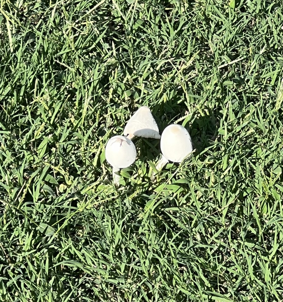 I have mentioned how when I take my dogs for a walk, I need to take each dog separately. While Loki is used to his harness and even excitedly “helps” me get it on, he has not mastered the art of walking. He strains at the leash or will stop to investigate some smell and then run full bore back to the end of the leash. I tried earlier to take both dogs, but Loki spent more time roughing with Zena than walking. This makes it a concentrated effort to train Loki to walk as we patrol the neighborhood. Zena instead likes to go to the park where she can see the sights, sniff the smells, and do her business (yes, I bring bags). After the rains and cooler temperatures last week, I noticed several sections of the park were sporting white dapperling mushrooms.