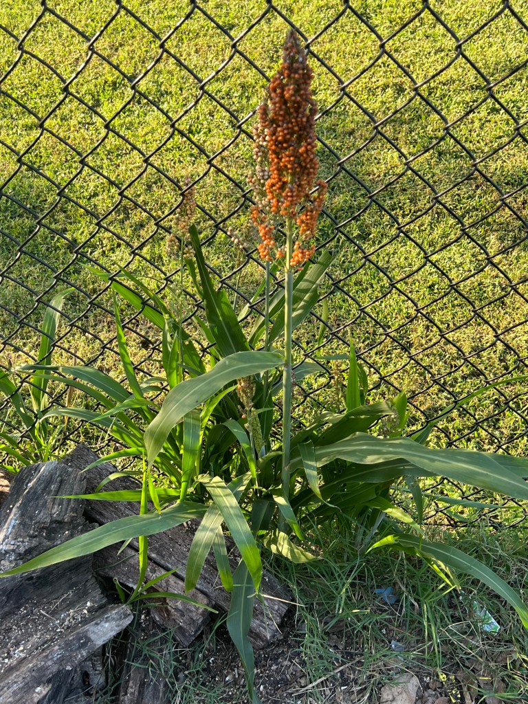 Several years ago, I spoke of the seeds that the birds throw out of my feeders. Some are tossed when the birds get in a frenzy of competition. Others are scattered because an individual bird does not like the seed and throws it out of the feeder as “unusable”. To be honest, I think most of the smaller seeds that fall to the ground are the result of several small holes in the screen in the bottom of the feeder. When I wrote, some of the scattered seed had taken root and sprouted just outside my patio fence. After the wheat (Triticum turgidum subsp. durum) matured I bound it together as a sheaf (it did not work well) and kept it on the porch to dry. Last year I was more consistent in my weed eating and the stalks were all cut down before they could develop. This year I had one stalk which grew inside the fence and out of the weed eater’s range. This has now matured as a large head of Proso millet.