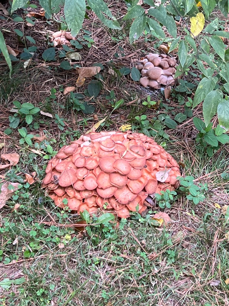 I do not always go behind our outbuilding when I mow. The view of the area is blocked by the building and the trees that are on either side. The area of only about 600 feet2 (56 m2) and much of it is covered with the dead needles of the large Loblolly Pine (Pinus taeda) on one side of the building. When I do go back to mow, I often find interesting things happening. Several years ago, I wrote about how a large portion of the area was covered with mock strawberries (Duchesnea indica). While the mock fruit is similar in appearance to wild strawberry (Fragaria vesca) it is not edible, although the plant itself has been used medicinally as an antiseptic, an anticoagulant, and in a poultice for boils and burns. The next year the gardener from the church that abuts our yard knocked on our door to say the large American elm (Ulmus americana) had blown down in the wind and was lying on their property. He asked if I would allow his friend to cut it up for firewood. I did allow it, or else I would have had to pay to have it removed. Last week when I went back to mow the area was covered with honey mushroom clusters.