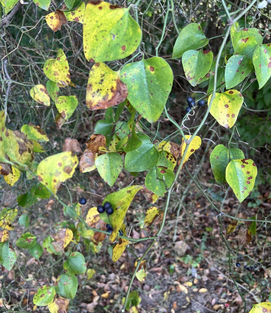 As I have been mowing along the back tree line of our yard, I have been running into a prickly vine that has slowly been taking over the overhanging limbs. I usually just ignore both the limbs and vines and mow around them. Occasionally I will plow the mower through the overhanging limbs and invariably the vines will catch on the noise reducing earmuffs I wear while mowing and pull them off. I had already cut back the limbs hanging down from the American elm (Ulmus americana) that sits near the outbuilding along with the Loblolly Pine (Pinus taeda). I had begun to cut back the limbs along the tree line at the same time but managed to break one handle off the lopping shears (I did not know you could break forged steel). Since I am in a fall cleanup mode (sorta) I decided it was time to take the garden pruners and get rid of the smaller diameter overhanging limbs along with the vines. When I examined the vines and the blackish berries that have ripened, I recognized it as greenbrier.