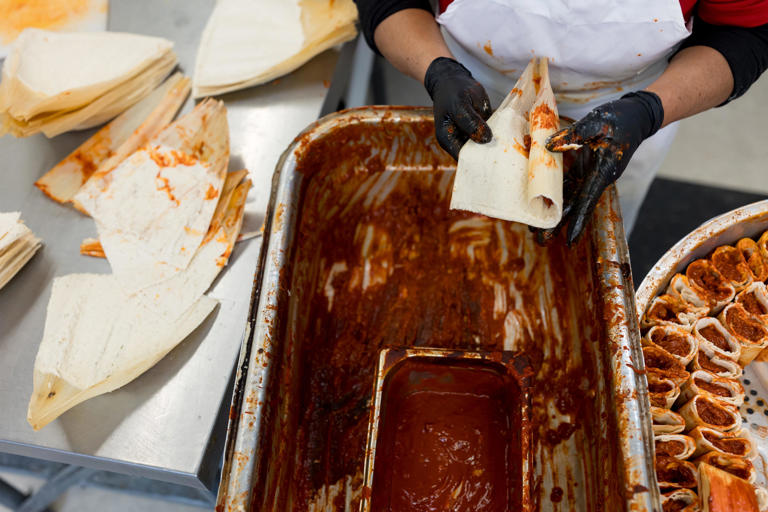 Many families in El Paso spend the holidays together preparing tamales for Christmas Eve. “People, when they think back to memories of their families, a lot of it’s centered around food,” said Melissa Santos of Food City. “Memories about food, how this tasted or the smell of this. So, whether they’re buying the ingredients from us, or they’re buying the readymade food, you know their tradition started here.” The process takes hours, even with many hands at work. It requires mixing the corn masa by hand with pork lard, preparing the savory or sweet fillings, soaking the corn husks, spreading a layer of masa on an open husk, spooning in filling, then carefully folding each tamal like a gift. The lot is placed in concentric circles in a large pot to steam-cook. In El Paso, the flavors are almost always the same: pork with red chiles, chicken with green chiles, cheese with green chiles, and sweet tamales studded with raisins. When the first hint of cold weather hits the Texas desert, a collective craving sets in and El Pasoans head to their favorite bakery or grocery to buy tamales by the dozen.