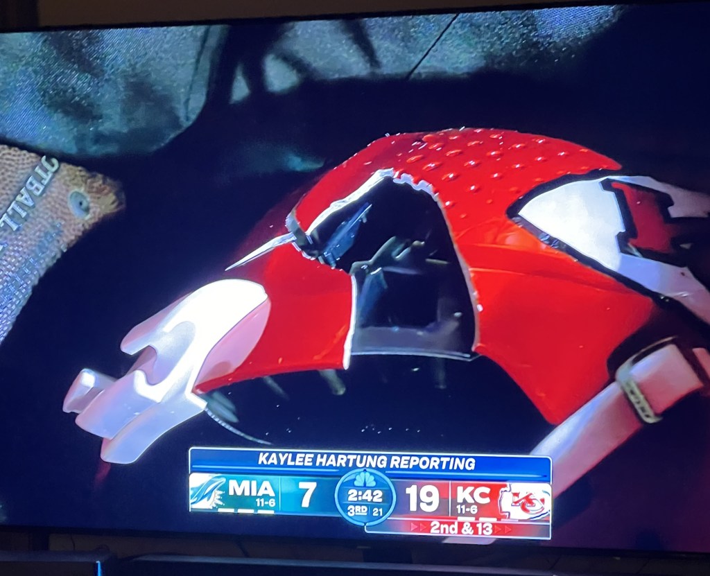 The broken helmet occurred when Mahomes took a helmet-to-helmet hit from Miami’s DeShon Elliot in the third quarter. While Mahomes shrugged off the hit, his helmet was not so lucky. The plastic headgear cracked, and a large piece was broken off. The image of Mahomes’ helmet cracking captured the attention of NFL fans, and the replays showed the three inch (7.5 cm) long piece of plastic flying through the air after the hit. Mahomes played several downs before the referee stopped the action and allowed Mahomes to switch out his helmet. The drive ended with a field goal. Maholmes worked on the new helmet while Miami had the ball, trying to stuff the old padding into the new one (it did not work) and trying to change out the face mask. Despite the irritation, Mahomes led the Chiefs to their second touchdown of the night on the next drive. The Chiefs won the game 26-7.