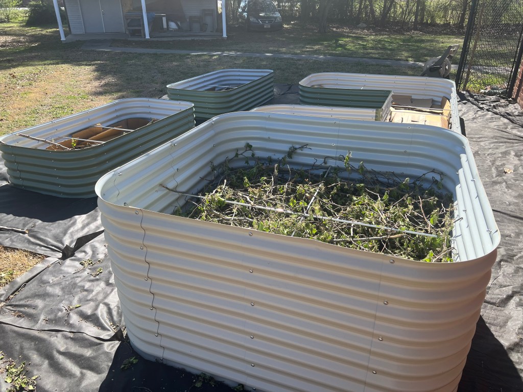 While I do not have a lot of wood in my suburban yard, I do have several trees that need to be trimmed. During the pre-Christmas sale season, I found a combination cordless electric leaf-blower and grass trimer along with a cordless chain saw that all use the same 40 volt battery. These will remove part of my carbon footprint while I take care of my lawn needs. Everything I read advised against major pruning on my Bradford pear (Pyrus calleryana) until the late winter or early spring as the tree was starting to wake up. This let me say I was waiting (not procrastinating) to do the work of trimming my tree and using the wood to fill my raised beds via hügelkultur. I started putting the four beds together in February, laid down the ground cloth for the spaces between the beds early in March, and this week began to trim my trees and fill my beds. I have more trimming and still need to fill two more beds with debris. Then comes the compost and soil.