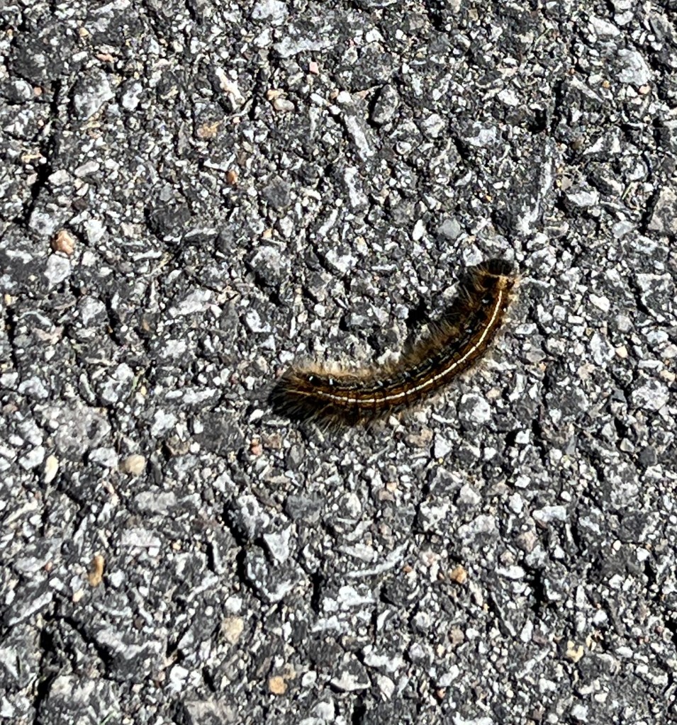 When I looked online, I found Eastern tent caterpillars are among the earliest caterpillars to appear in the spring. Because the early spring weather is often cold, the caterpillars rely on the heat of the sun to elevate their body temperatures to levels that allow them to digest their food. Studies show these caterpillars are unable to process the food in their guts when temperatures are below 59F (15C). The early stages (instars) are black, and their bodies readily absorb heat. When basking, they typically pack together tightly, reducing heat loss due to convective currents. The caterpillars may aggregate on the surface of the tent or within it, which acts as a miniature greenhouse and traps the heat of the morning sun. An aggregation of basking caterpillars can easily overheat, so the aggregation splits up when they reach a satisfactory temperature. The one we spotted had clearly gone off for a walk on its own as it continued its journey to maturity as a moth.
