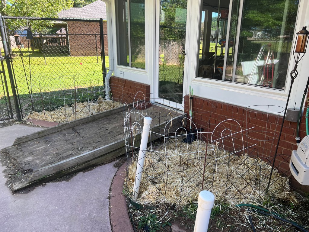 I mentioned several days ago that I intended to plant 10 hills of potatoes. I had found (at last) the seed potatoes at the local co-op on “close out” and when the salesperson saw how few I was buying he gave them to me for free and told me to get more if I wanted. I did not want to be greedy nor to waste potential seed potatoes someone else might need, but I did pick out three more. I worked my way over the fence around one of the beds and weeded and re-loosened the soil. I had my bag of potatoes but realized I had left the cages on the other side of the deck. “Melissa?!?” She was kind enough to bring the cages to me. I like to cage the plants to help me know where the potatoes are supposed to be when I water and to support the indeterminant vines. I was able to get 13 hills of seed potatoes in the ground, cage them, and mulch them with straw. Only 120 days to go.