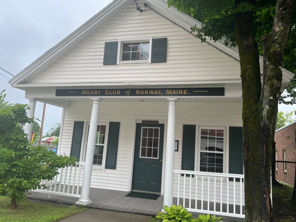 During our Sunday tour we came across another New England staple still operating today. The Weary Club was founded in the Norway community in 1923 by Advertiser Democrat (newspaper) owner and publisher Fred Sanborn. Sanborn rented a vacant store on Main Street where a group of like-minded friends and businessmen could meet and share pastimes, such as playing cribbage, smoking, chewing tobacco, and conversation. By 1926 the group had christened itself the Weary Club, built a clubhouse, established a board of officers and directors, and established a set of by-laws. Gambling and drinking were not allowed, but local gossip was permitted. No more than 200 members were allowed, and applicants might have to wait for a member to die before they were approved to join. A lifetime membership cost US$25 (currently US$50) and was granted to those who could whittle a “shaving light enough to float.” The requirement was later dropped as whittling became passe. Ben Tucker, longtime member and historian said, “The main function of our club now is that one Saturday morning a month from 8 to 9:30 we share coffee and doughnuts”, along with conversation. The Weary Club is a continuing example of the early era social clubs established for sharing political wisdom and Yankee philosophy.