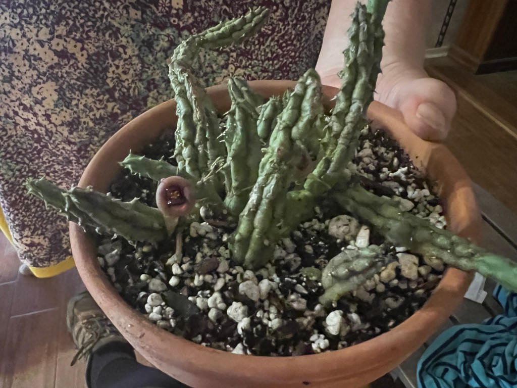 I was working in my office yesterday when Melissa brought in one of her succulents. This was from a stem cutting she had obtained from a grower friend in California two years ago. She had replanted and cared for it, moving it from the house to the porch to shield it from the extremes of Arkansas’ heat and cold. Melissa was excited because it had a star-shaped bloom on one of the new stems that had grown from the original cutting. She mentioned it usually takes two to three years for flowers to form on cuttings from the original. The friend’s plant had grown to a large amorphous mass. The succulent is easy to grow but is not common in the US as it is native to Africa. The common name for this succulent is the African starfish flower.