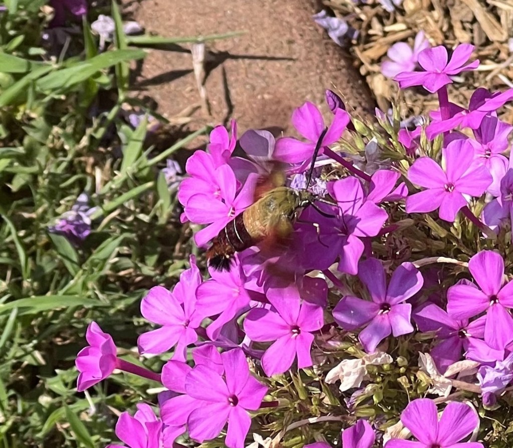 When I looked online, I found the Hummingbird Clearwing (Hemaris thysbe) is a moth of the hawkmoth family (Sphingidae). Coloration of the clearwing varies between individuals, but typically the moth is olive green and burgundy on its back, and white or yellow and burgundy on the underside. Its wings are transparent (i.e., “clearwing”) with a reddish-brown border. Its legs are light-colored, which combined with the lack of striping on the underside is a diagnostic for the species. The clearwing range extends from Alaska to Oregon in the west and from Newfoundland to Florida in the east. It is a migratory species and is most common in the eastern US and southern Ontario, Canada. The moth beats its wings quite rapidly and has a wingspan of 1.6 to 2.2 inches (4 to 5.5 cm). The clearwing has two broods a year in the southern portion of its range, but only one in the north. The clearwing lives in second-growth forest, in meadows, and is commonly found in the cultivated gardens of suburbia (like mine). It has minimal economic impact to humans, being neither a crop pollinator nor pest. The moth does pollinate several cultivated flowers and is the primary pollinator for some species of orchid. The species is not endangered or threatened.