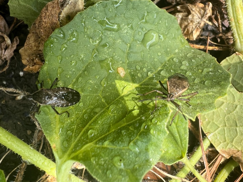 It has been difficult to keep up with the cantaloupes (Cucumis melo, honey melon variety) my plants have been producing. I have taken to eating these fruits as a snack most afternoons when I do not eat some of the watermelon (Citrullus lanatus, rattlesnake variety) I have also grown. This has been a healthy and delicious way to get a cool treat in the middle of a hot summer day. Several weeks ago, I noticed the leaves and vines of both the cantaloupe and cucumbers (Cucumis sativus) were beginning to wilt and die. I assumed it was from a combination of the heat and a natural occurrence of the vines end of life, especially since they were prolific producers. However, this morning I took a closer look and saw the vines were infested with large bugs crawling all over the plants. I learned they are aptly called squash bugs.