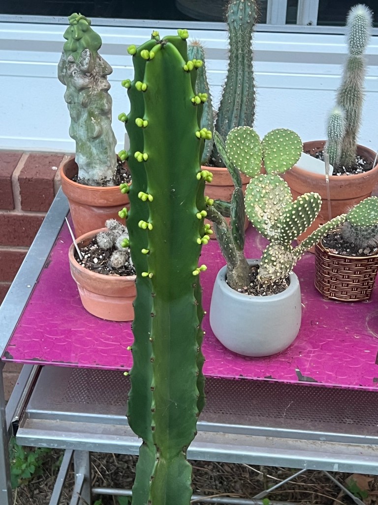 Euphorbia ingens grows well both indoors and outdoors and has become a popular choice for rock gardens and indoor houseplant collections due to its stately appearance and low maintenance. In their natural environment, these succulents can grow up to 40 feet (12 m) tall, but they usually top out around 8 to 10 feet (2.5 to 3 m) tall when grown indoors. Still, even this would take a high ceiling to accommodate a mature plant. When grown indoors or in containers, it is extremely uncommon for this species of euphorbia to produce blooms. Since Melissa’s plant has budded, we are waiting to see if it will break into full bloom.