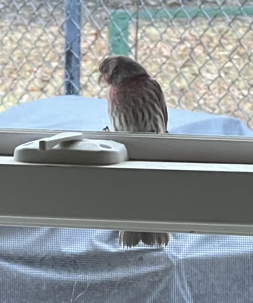 Melissa received a window box bird feeder as a gift from our son and family earlier this year. The feeder has suction cups on the back that allow it to attach directly to the glass. I placed the feeder in the bay window in the breakfast nook that serves as her home office so she can enjoy the bird activity while working. I fill the two sections of the feeder with different seeds to make it more attractive to the small birds willing to approach the window. One side has always had black sunflower seed (Helianthus annuus). I have varied the seed on the other side, but it currently has cracked safflower seed (Carthamus tinctorius). This feeder has become a preference for the eastern bluebirds (Sialia sialis), the sparrows (Genus, Zonotrichia), and purple finches (Haemorhous purpureus) that frequent our back yard. On Sunday I noticed what seemed to be a new species at the feeder. This was similar to the finches I have been watching but somehow seemed different. When I checked my bird ID this turned out to be a house finch.