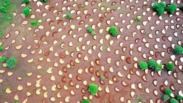 When I looked online, I found a bund, also known as a demi-lune or half-moon, is a rainwater harvesting technique consisting in digging semi-lunar holes in the ground with the opening perpendicular to the flow of water. The holes are oriented against the slope of the ground which generates a small dike in the curved area with the soil from the hole itself. The dikes capture the rainwater as it runs downhill, allows the water to seep into the subsoil, and prevents the loss of fertile soil by erosion. Semi-circular bunds are used to reforest arid zones with irregular rain patterns and allow the growth of plants and trees. The TREES initiative works closely with tens of thousands of farmers living in poverty on degraded lands following decades of unsustainable agriculture practices, deforestation, pollution, and climate change by providing training in a regenerative agroforestry technique called the Forest Garden Approach. In this four-year program, farmers receive training, seeds, and other resources, while planting thousands of trees and dozens of food and resource crops on their property. The small farmers typically own less than 2.5 acres (1 ha) of land.