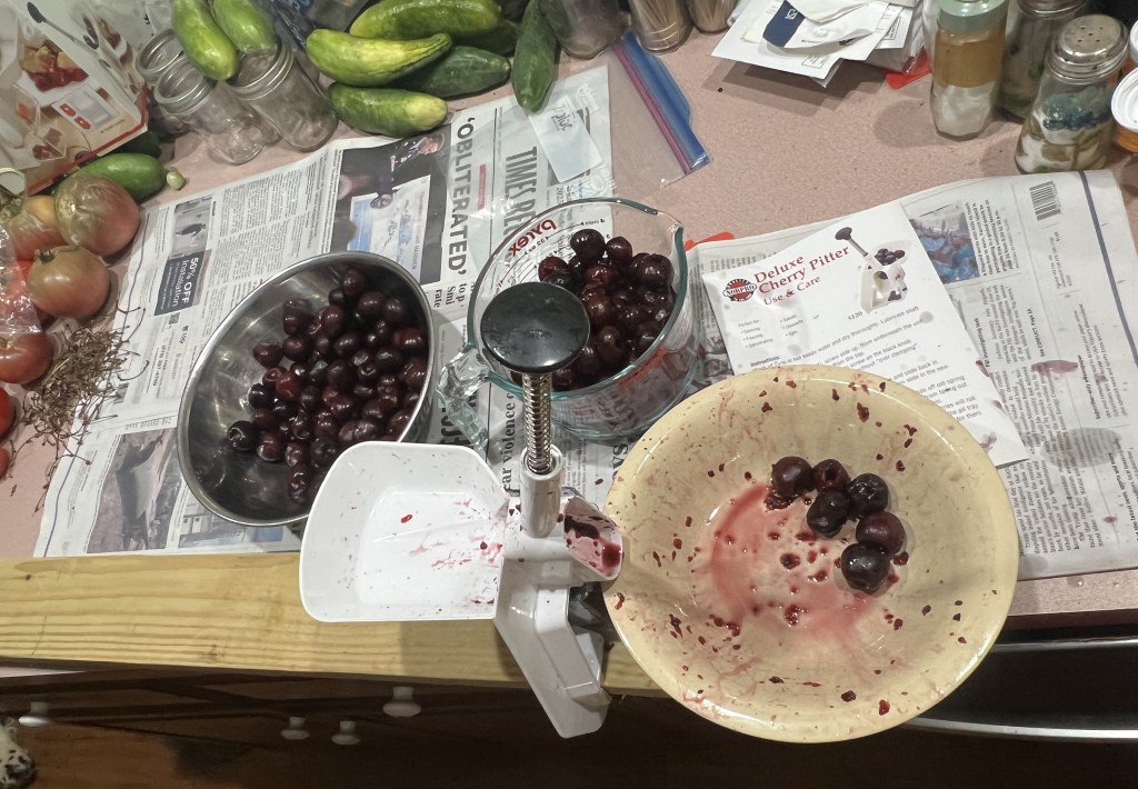 THOUGHTS: As we were pitting the cherries Melissa came up with several ways to use them.  We made four cups into two pints brandied cherries, one of which was destined to become cheesecake.  Another four cups were reserved to become cherry crisp.  The last batch we left unpitted for Melissa to snack on.  The first cherry pitter dates to the 1880’s as home cooks sought to simplify the task of cutting the stones out of the cherries for canning, baking, or other food uses.  A straw or chopstick can also be used to push out the pit.  The pitter I used reminded me of the cotton gin invented by Eli Whitney in 1793.  Both were designed to speed up the process and reduce the tedious task of seed extraction.  Mechanical ingenuity saves time.  These savings could/should be put back into building your family or community.  Act for all.  Change is coming and it starts with you.