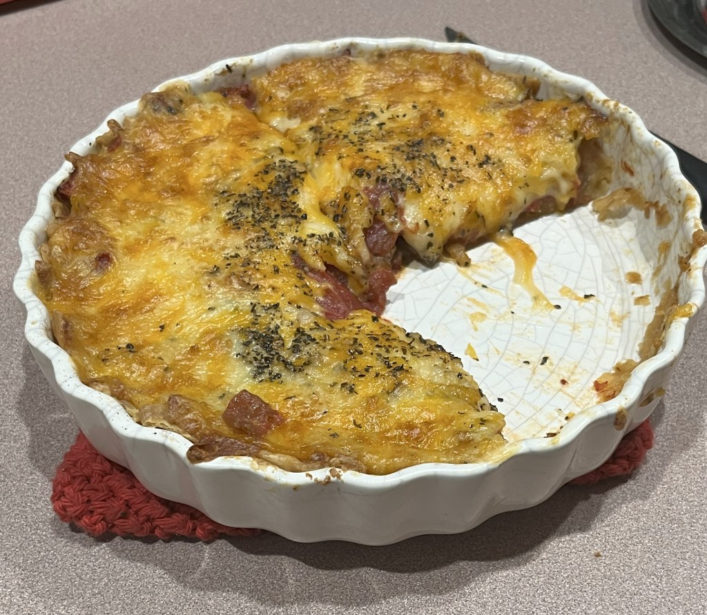 When I went online, I found Southern tomato pie is a tomato dish popular in the Southern US (hence, the name).  The dish consists of a pie shell with a filling of tomatoes (Solanum lycopersicum), that are sometimes with basil or other herb), then covered with a topping of grated cheese mixed with either mayonnaise or a white sauce.  Tomato pie is considered a summer dish that is to be made when tomatoes are in season.  While tomato pie has its roots in Italian American cuisine, and particularly Philadelphia, it has become a popular and classic dish in the South during the summer months when tomatoes are at their peak.  Southern tomato pie is enjoyed both as a main course and a side dish, and is a staple at potlucks, picnics, and casual gatherings.  A sweet version called green tomato pie uses buttered and sugared green tomatoes, with a recipe dating at least as far back as 1877.  The taste of green tomato pie is comparable to green apple pie.  The sweet version is less common than the savory Southern tomato pie.  In the US, tomato pie may also refer to some types of pizza, like Sicilian pizza (originated in Sicily), Italian tomato pie (thick dough with tomato sauce on top).  In its simplest form, a Philly tomato pie is pizza with no cheese.