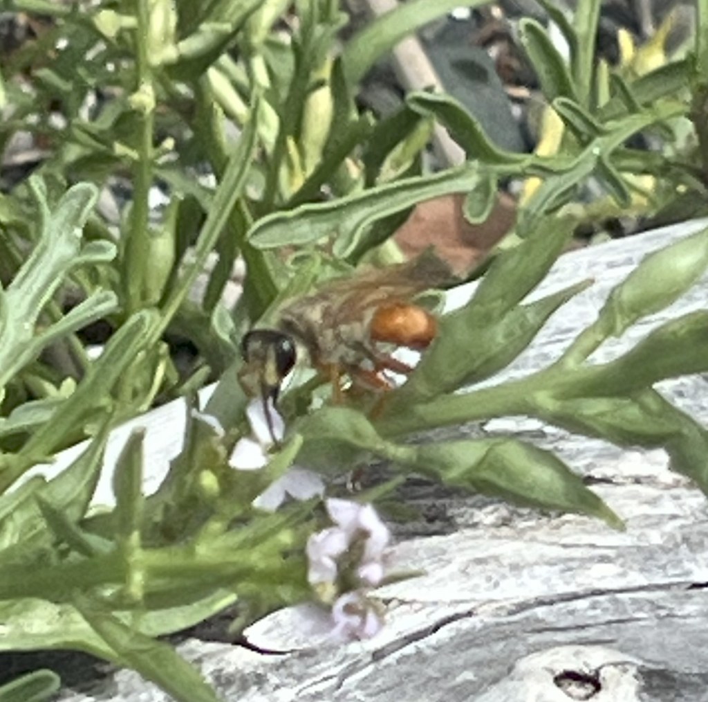 Following my disappointment fishing while at the coast last week I decided to walk through the beach community and see if I could spot some birds that were not yet on my list. I took the road through the community first to try and spot land birds. I was able to see two species I already recorded, an American Crow (Corvus brachyrhynchos) and a flock of house sparrows (Passer domesticus). It was not until I returned along the beach that I picked out several forms of gulls (California gull, Larus californicus; western gull, Larus occidentalis; short-billed gull, Larus brachyrhynchus) and a flock of white-winged scoter (Melanitta deglandi) ducks. The beaches along the Puget Sound tend to be small well-worn rock rather than the sand I associat with other coasts. This is harder to walk on, and it took me a while to get back to the house. When I arrived, my daughter-in-law showed me a picture of the unusual wasp they had encountered on their beach walk (other direction). It was a large golden digger sand wasp.