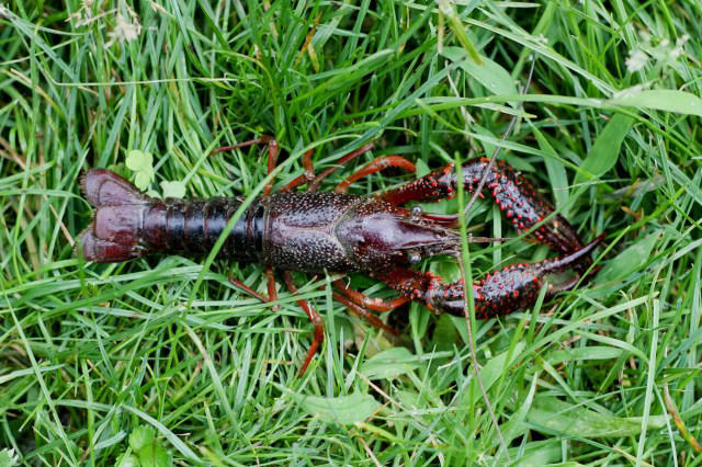 When I went online, I found the red swamp crayfish (Procambarus clarkii), also called the Louisiana crawfish or mudbug, is a species of the cambarid family of crayfish native to freshwater bodies of northern Mexico, and southern and southeastern US.  It has also been introduced elsewhere in both North America and other continents where it is often an invasive pest.  The red swamp is typically dark red, with long claws and head, small or no spines on the sides of its upper section of the shell (carapace) just below the head, and rows of bright red bumps on the front and side of the first leg.  The native range is from northern Mexico and far southeastern New Mexico, through the Gulf States to the Florida Panhandle, as well as inland north through the Mississippi Basin to southern Illinois.  It has also been introduced outside its natural range to countries in Asia, Africa, Europe, and the Americas.  Individuals are reported to cross many miles of relatively dry ground, especially in wet seasons, although the aquarium trade and anglers may have hastened the spread in some areas.