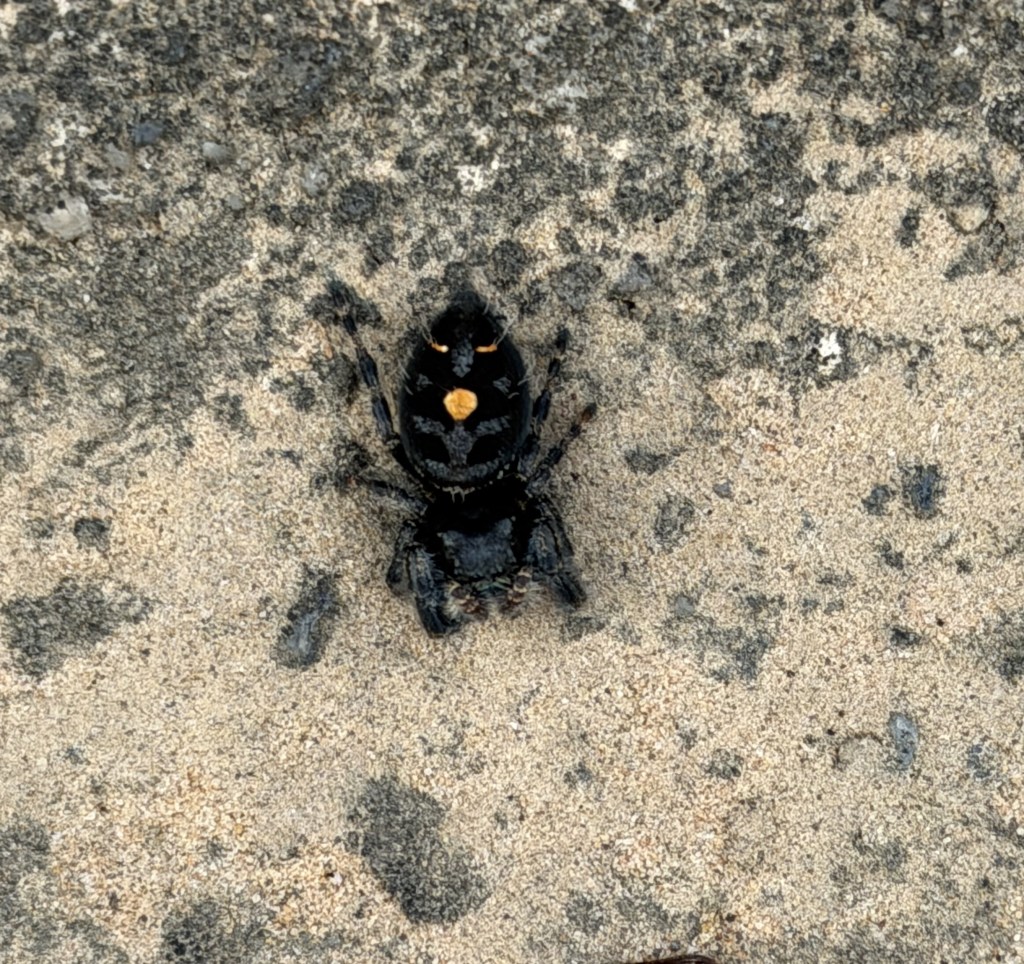 When I went online, I found the bold jumper (Phidippus audax), also known as the daring jumping spider, is a common species of spider belonging to the genus Phidippus. This group of jumping spiders easily identified by their large eyes and their iridescent mouth parts (chelicerae). They are typically black with a distinct white triangle on their abdomen. Like all jumping spiders, they have excellent stereoscopic vision that aids them in stalking prey and facilitates visual communication with potential mates during courting. The species are native to North America and have been introduced to Hawaii, Nicobar Islands, Azores, and the Netherlands. The Bold jumper is a solitary carnivore that uses their highly specialized eyesight to actively hunt and stalk a variety of insects and non-insect terrestrial arthropods such as caterpillars (order Lepidoptera), dragonflies (infraorder Anisoptera), grasshoppers (suborder Caelifera), and other spiders (order Araneae). They are one of the most common spiders found in agricultural areas and have been studied to determine their impact on crop pest populations. New Hampshire Governor Chris Sununu signed the HB 318 bill on June 11, 2021, designating the bold jumper as the state spider following a campaign by a class in Hollis, New Hampshire.
