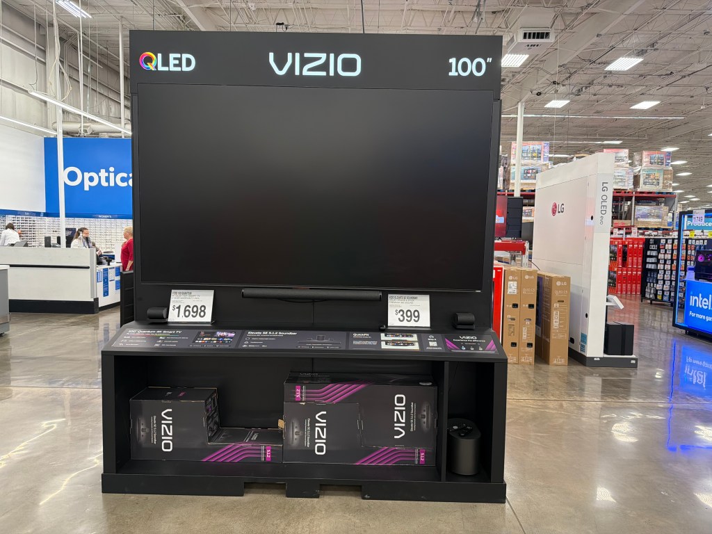 The 2021 C class RV we purchased this summer had a TV mounted inside, but it was an older model. This was a special 40-inch (101.6 cm) RV TV built to withstand the vibrations and temperature changes of being on the road and had a 12V power option that was connected directly to the house batteries for use when not plugged into shore power. We were told a regular TV might not handle the constant shaking or the temperature and humidity fluctuations. Melissa did quite a bit of searching online and in the RV Facebook group she frequents and determined a regular smart HDTV would be adequate for our use. She also checked the dimensions of the cab and found the space would easily accommodate up to a 55-inch (139.7 cm) TV. We have purchased several TVs over the last several years, including two 70-inch (177.8 cm) screens at the conference center where I was director. Each time we found the best (or comparable) deals were from the big box store. Last week I decided it was time to bite the bullet and purchase a new TV. When I walked into the store, I was confronted with a display featuring a 100-inch (254 cm) screen TV.