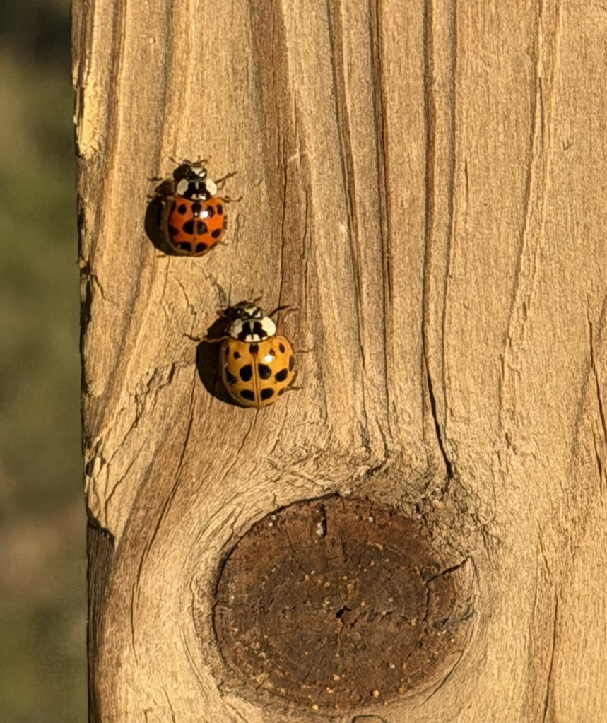 When I went online, I found a lady beetle or ladybird (Harmonia axyridis) is a species commonly known as the harlequin, Asian, or multicolored Asian lady beetle. This is one of the most variable lady beetle species in the world with a wide range of color forms. The species is native to eastern Asia and has been artificially introduced to North America and Europe to control aphids (family Aphididae) and scale insects (Superfamily, Coccoidea). It is now common and spreading in those regions and has also been established in Africa and across South America. Individuals are beetles in shape and structure, being domed and having a “smooth” transition between their wing coverings (elytra), thorax (pronotum), and head. It ranges from 0.22 to 0.34 inches (5.5 to 8.5 mm) in size. The common color form is orange or red with 0 to 22 black spots of variable size. The bright color makes the species conspicuous in North America and may be known locally as the Halloween beetle as they often invade homes during October to overwinter.