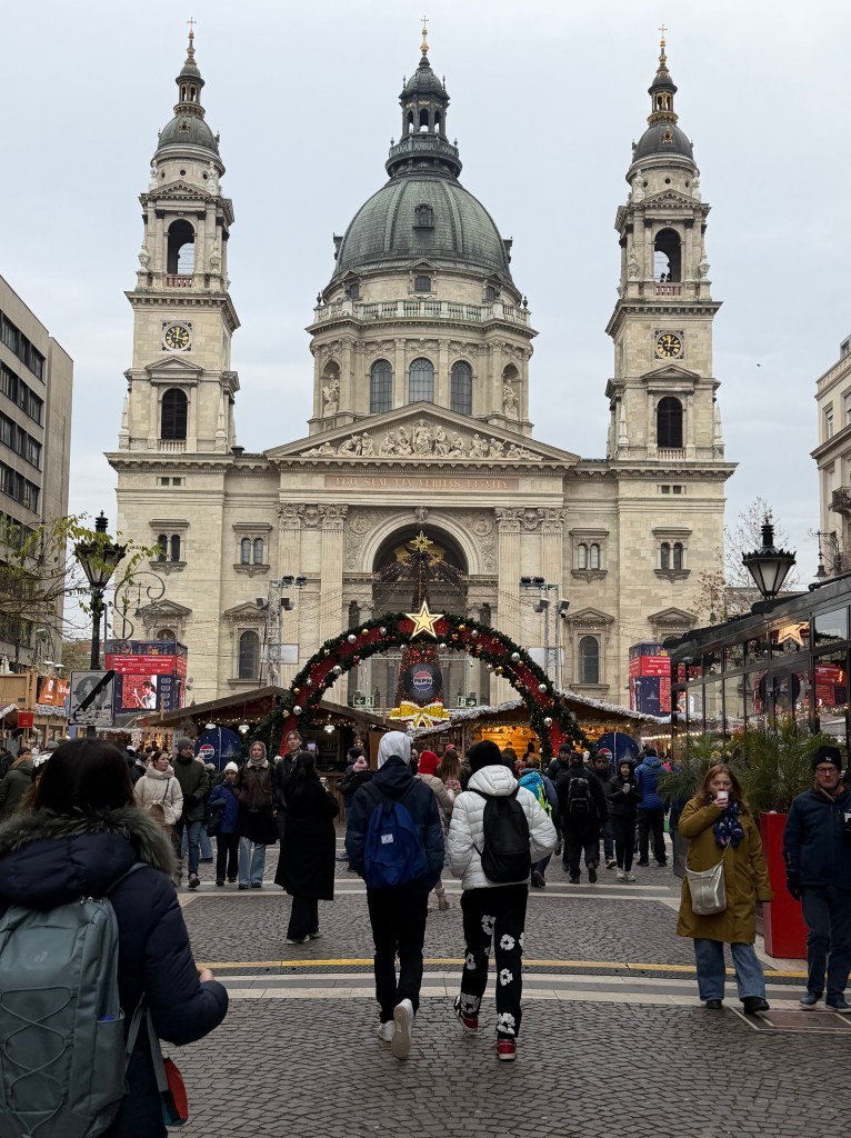 When I checked with the concierge desk I was told to go to a bank or exchange station to convert my currency to forint. We had decided to go to St. Stephen’s Basilica which was only a few blocks farther and (sort of) in the direction of the cruise dock. As we approached, we saw a Christmas market in full swing on the streets surrounding the church. We knew there would be shops, and after last night’s experience I wanted at least some forint for a purchase. We found an exchange shop not far from the market. It turned out they did not know how to convert US$ into Forint (?) but it was easy to convert with Euros. We had prepared our credit card with our trip as they accepted foreign exchanges (no fee). Armed with nearly 17,000 Forint (50 Euro) we were ready to face the markets. We browsed the shop and food venders on our way to the basilica, deciding what to eat on our return. When we arrived at St. Stephens, we were both cold and decided to see the exterior rather than the tour. We then stopped for a large Hungarian sausage, potato cake, and stuffed cabbage. None of the shops took cash, so we used our credit card. Now what to do with 17,000 Forint.