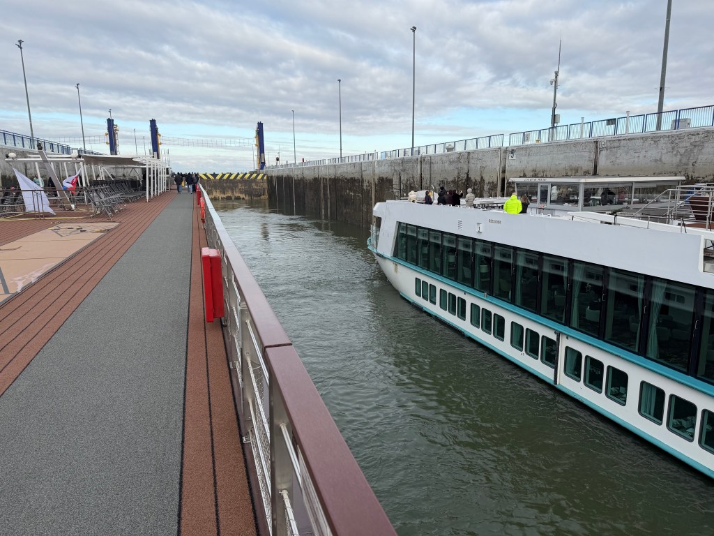 When I went online, I found the Danube has a series of locks to allow river passage associated with the 18 river power plants (from Kelheim to Sulina) that generate energy from the dams. These locks are of either one (4) or two (14) chambers that can allow simultaneous locking of vessels travelling upstream and downstream. The steep gradient of the Upper Danube (Kelheim and Gönyu) has 16 power plants with locks, while the Middle and Lower Danube has only 2 locks situated at the Iron Gates, a gorge forged by the Danube through the Carpathians, which forms the border between Romania and Serbia. The Iron Gate locks are also the largest on the Danube. Iron Gate I (river km 942.90) and Iron Gate II (river km 863.70/ 862.85) each have two lock chambers which are 1017 feet (310 m) long and 111.5 feet (34 m) wide, located on the right bank and the left bank. The lock chambers on the right bank (Djerdap I and II) are maintained and run by Serbia, while those on the left bank (Portile de Fier I and II) are maintained and run by Romania.