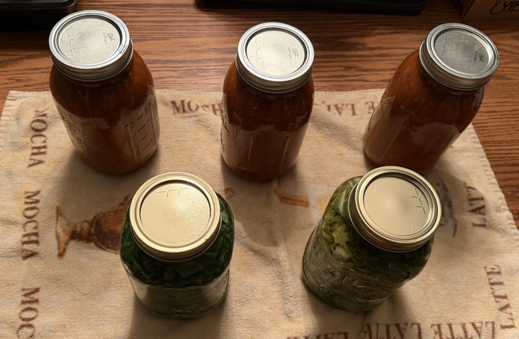 Two days later (today) I decided to finish processing my last fruits. I added salt to the bowls of leaves and kneaded it for 5 minutes to break the leaves down and then packed them into quart jars, one for the outer leaves and another for the inner. Working with my last fruits got me motivated to work the tomatoes frozen tomatoes (Solanum lycopersicum) and sweet peppers (Capsicum annuum) from August into more canned pasta sauce. I added two red onions (Allium cepa) and three cans of diced tomatoes from the pantry along with spices and simmered it for four hours to render it down and meld the flavors. While the sauce was finishing up, I brought the water bath to boil to sterilize four 1-quart jars and lids. While I only used three, I have found it is easier to not use a jar than try and prepare another jar while everything else is ready. I transferred the sauce into the jars, added lemon juice (for acidity), and let them boil for 45 minutes. My last fruits were finished.