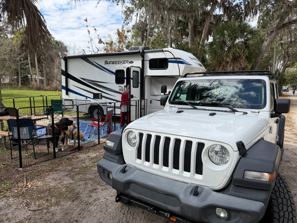 A lot has happened since we set out on our first long distance RV trip last week. We spent the first night in a Love’s gas station parking lot, which was like camping in a parking lot (because it was). The next two nights we spent in a state park and private RV campground. Both were nice but closer quarters than we were used to (with our vast experience, haha). The drama started immediately. I set up the jeep as a toad (pulled) vehicle and installed the Blue Rhino barking system. For some reason I could not get the brake to secure. Since the dealer was on our way out of town, we decided to stop and ask what we were doing wrong. It turned out the “problem” was I had set the seat too close to the auto brake. The tech moved the seat back 1/4 inch (0.3 cm) and it worked fine. The next difficulty came as I tried to back the toad (jeep) and found when the transmission is disengaged the wheels lock in reverse. The final drama came on the third day of driving as the brake system kept turning off. I reset the jeep to ACC twice before giving up. When we arrived at our campsite, I found the battery on our jeep JL was completely dead.