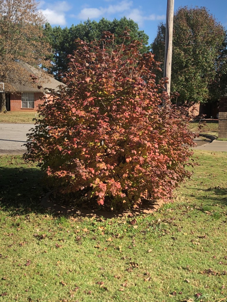 I have mentioned going outside and seeing the street sweeper, but the real purpose was to comply with Melissa’s request to look at the Snowball bush (Hydrangea arborescens). While it had valiantly tried to sport flowers the last two weeks (one cluster only), this week it finally decided to call it quits and acknowledge that fall was here and winter was approaching fast. Even in defeat its leaves had turned a beautiful red. I had to admit, it was a lot prettier than the street sweeper.