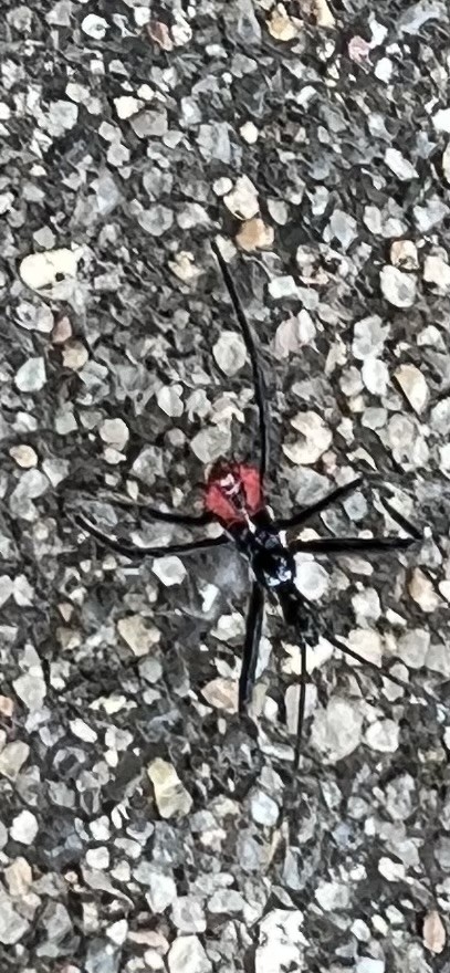 Last weekend I decided to weed the succulent bed beside the drive.  Melissa planted the bed with white stonecrops (Sedum album) mats placed around the 4-foot by 3-foot (1.2 m by .9 m) bed.  The bed sits under the Bradford pear (Pyrus calleryana) tree I had trimmed for the limbs and branches that made up the base layer of my hügelkultur raised beds made last year.  The problem was the bed was filled with dead leaves and the invasive Bermuda grass (Cynodon dactylon) from the surrounding yard.  After an hour of concentrated effort, I amassed a large pile of grass, leaves, and weeds on the driveway.  I raked the debris into a pile and scooped it up to place in the trash bin (I do not have a large compost pile, yet).  When I came back to blow the remaining debris onto the yard, I noticed a small insect with a red back scurrying across the drive.  At first, I thought it was a Black widow (Latrodectus hesperus) spider dislodged from the debris.  A closer look showed the creature had 6 legs, meaning it was an insect rather than a spider.  I took a picture and googled the bug, and it was identified as an assassin bug, or more specifically a North American wheel bug.