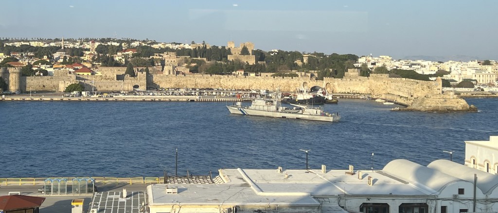 When we arrived in Rhodes I was not prepared for the abrupt shift in focus (time and culture). The Greek sites we had been touring dated from the Classical – Hellenistic – Roman eras, or the 1000-year period from 600 BCE to 400 CE. Rhodes seemed to jump forward another 1000 years to concentrate on the later times of the Crusaders (14th and 16th centuries CE) and the Ottomans who controlled the island and city until the early 20th century. Our tour of Rhodes featured this Medieval history.